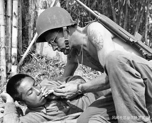 1944年3月31日,在緬甸北部的胡康河谷,一名美軍士兵彎下腰來給一名中國傷員點燃香煙。