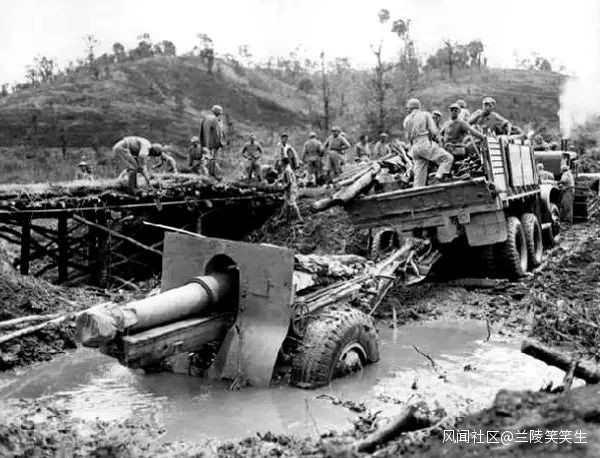 1945年2月15日,在緬甸臘戍以北55英里處,第2炮兵連的一門155毫米榴彈炮陷入溪流,找來一台卡車拖拽。
