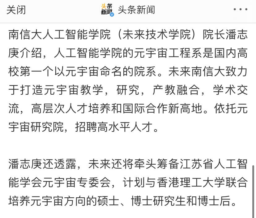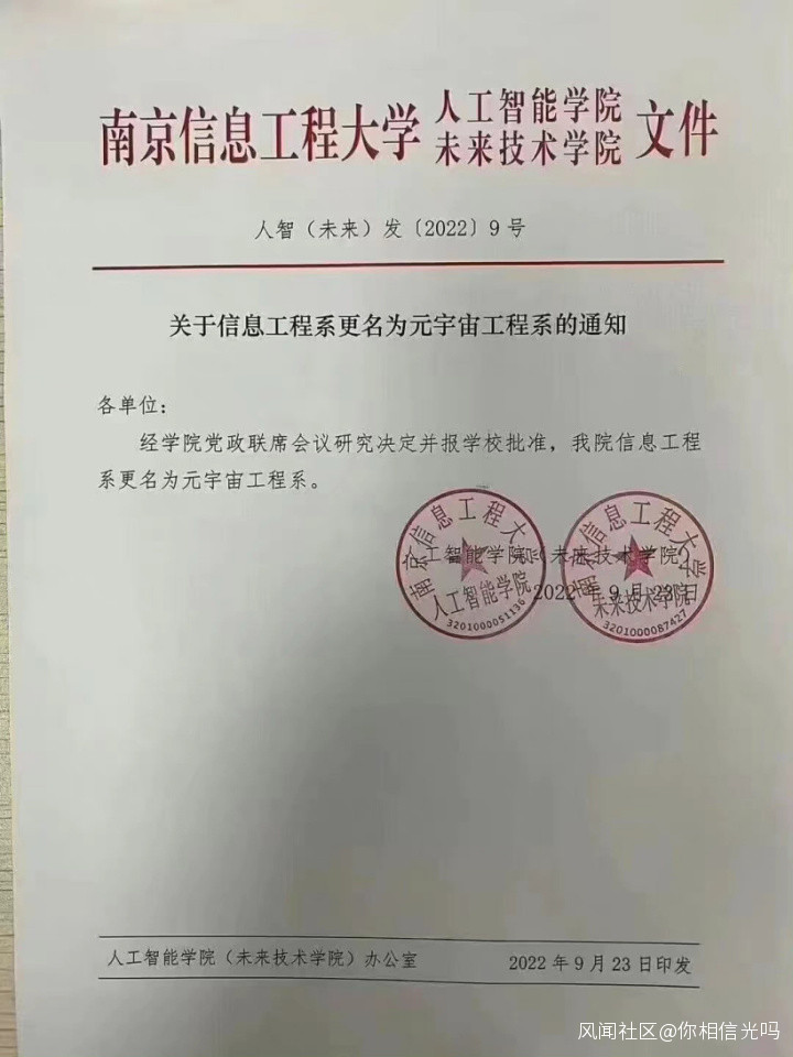 有媒體報道,9月23日,南京信息工程大學人工智能學院(未來技術學院)信息工程系更名為元宇宙工程系。9月23日,人工智能學院(未來技術學院)印發《關於信息工程系更名為元宇宙系的通知》,通知顯示,經學院黨政聯席會議研究決定並報學校批准,該院信息工程系更名為元宇宙工程系。