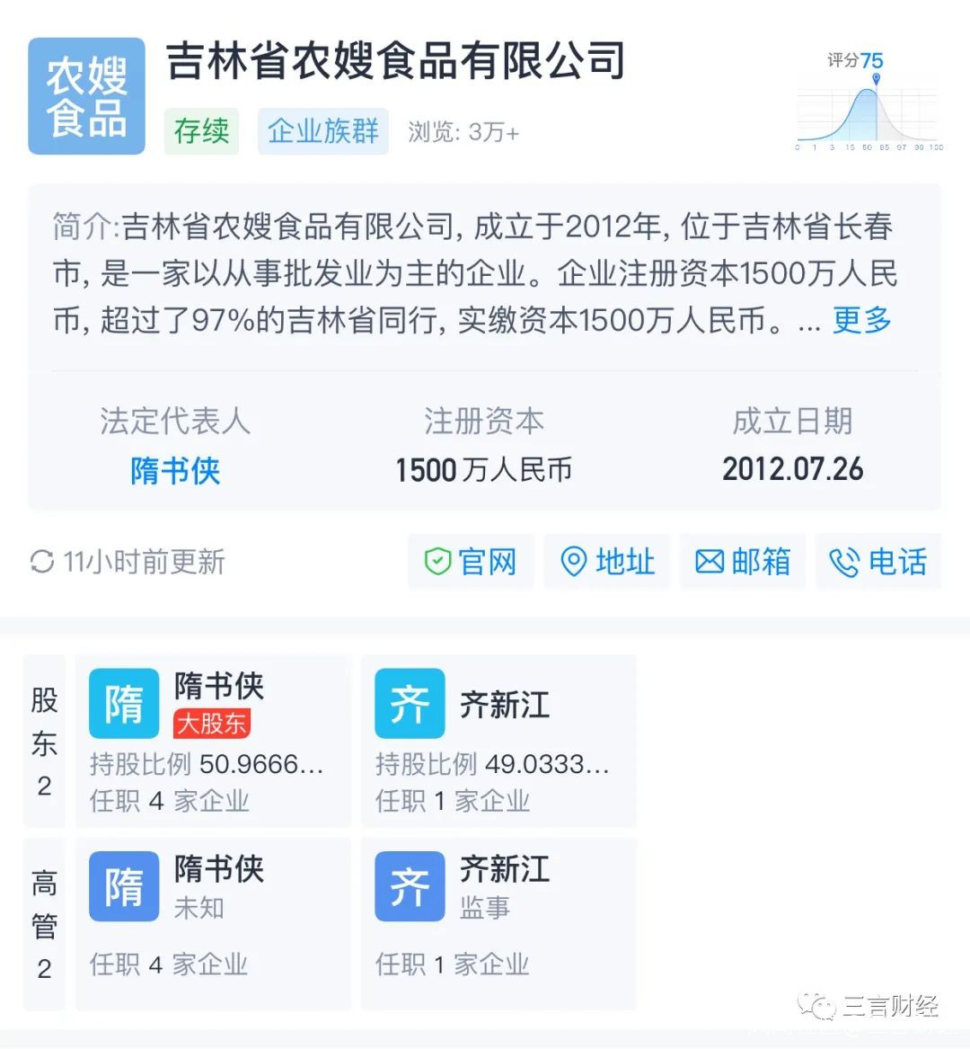 據天眼查,農嫂食品有限公司成立於2012年7月26日,註冊資本1500萬元,公司大股東為創始人隋書俠,持股比例51%;次股東齊新江,持股比例49%。