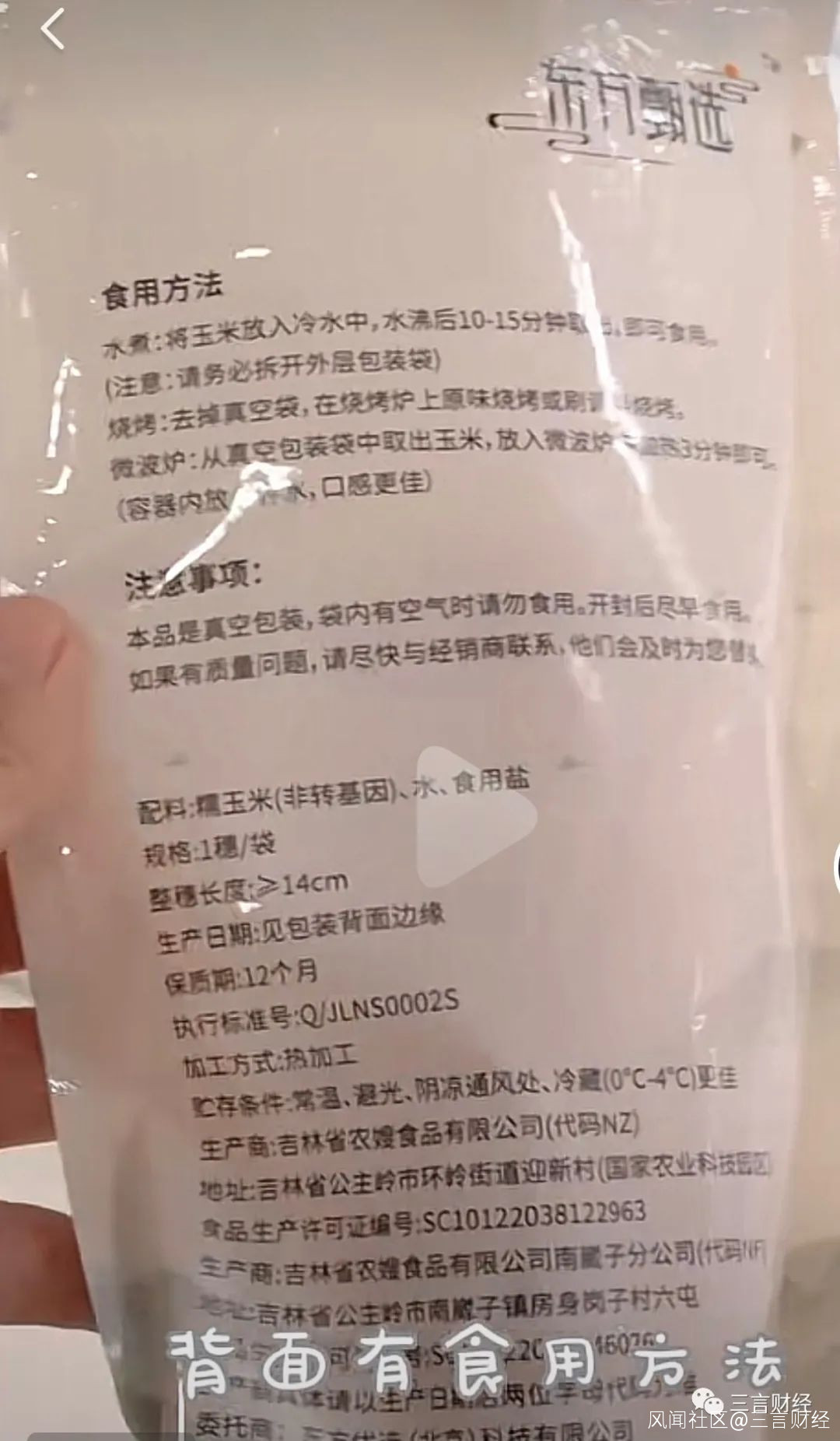 根據網友上傳的評測視頻顯示,東方甄選鮮食玉米的供應商為吉林省農嫂食品有限公司。