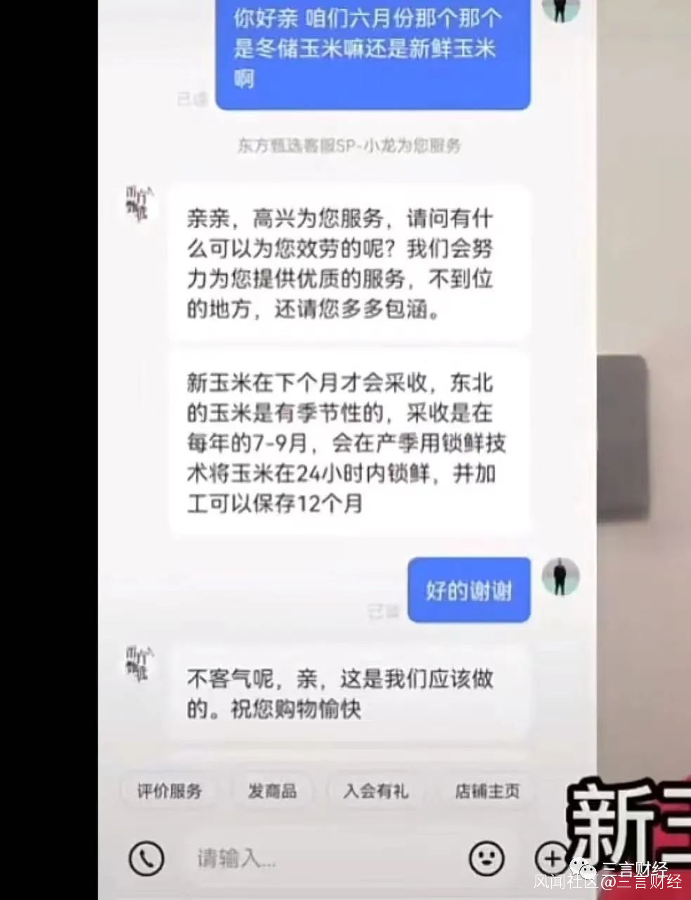 並且有網友就此問題諮詢東方甄選客服,對方也確認所售玉米是採用的冬儲玉米。但是,今日三言就同樣問題諮詢東方甄選客服,對方以玉米已下架為由拒絕回答。