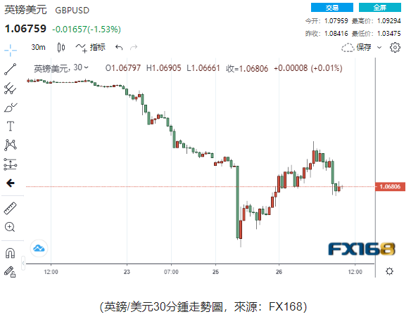 數據顯示,英鎊三個月隱含期權波動率週一觸及19.785%的日內高點,為2016年6月底英國脱歐公投結果以來的最高水平,當時波動率超過22%。今天早些時候,英鎊/美元一度跌超5%至1.03475的低點,這是自20世紀70年代初該貨幣對跌落至2.00下方以來的最低水平。目前英鎊/美元已經回升至1.0676左右,為多年來波動最大的交易日之一。