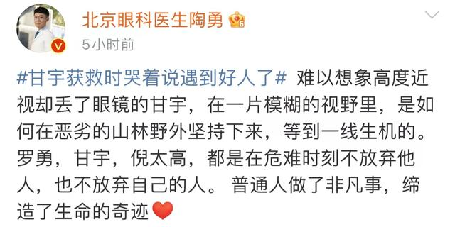 常人很難想象得到,高度近視卻丟了眼鏡的甘宇,在一片模糊的視野裏,是如何在惡劣的山林野外堅持下來,等到一線生機的。