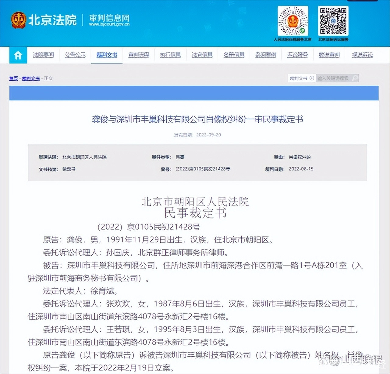 天眼查公開的法律文書顯示:原告龔俊稱,被告深圳豐巢科技有限公司(以下簡稱豐巢)以虛假代言方式擅用原告姓名、肖像,侵犯原告姓名權、肖像權。