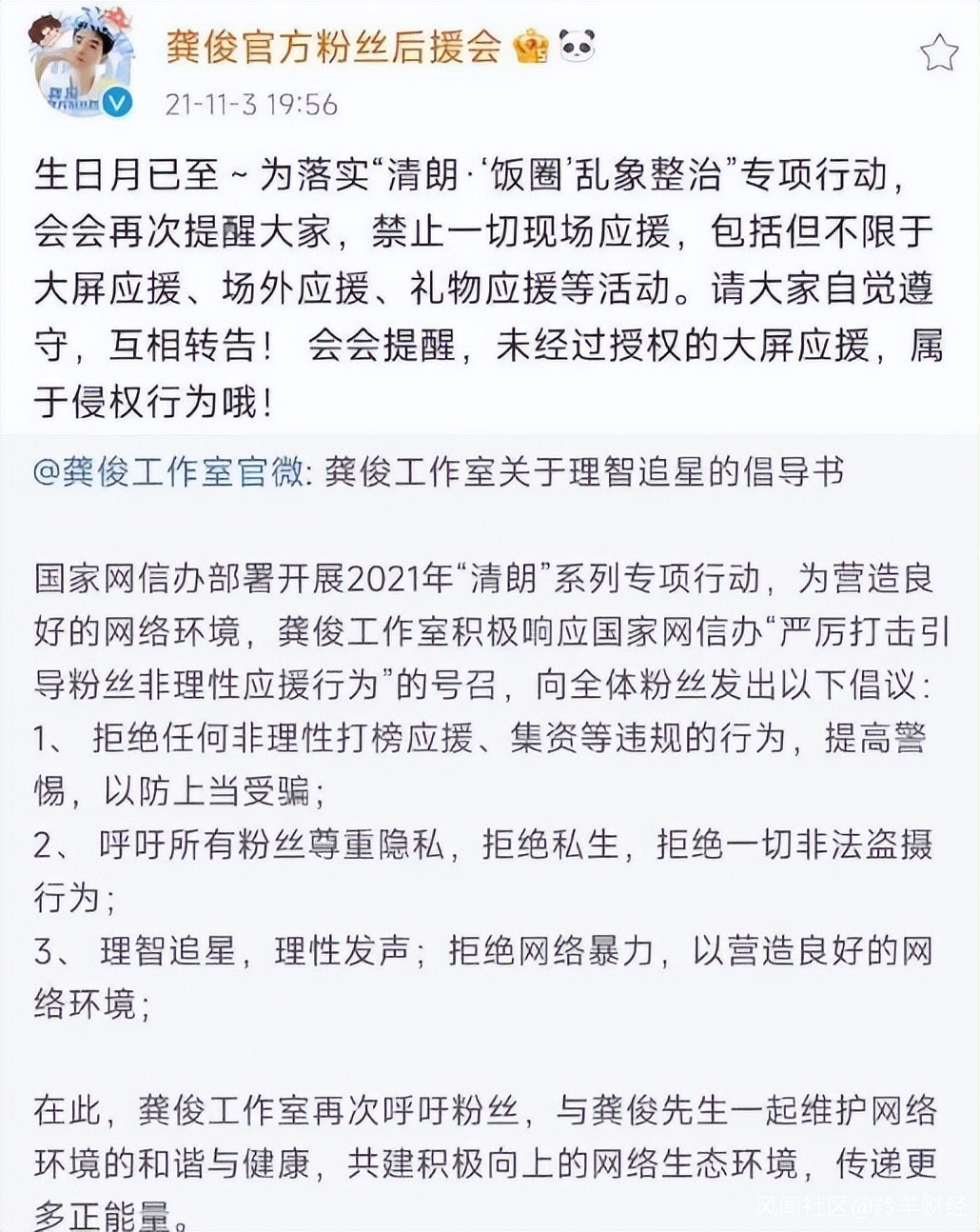 粉絲花錢為偶像買霸屏,曾被龔俊提醒制止稱,違反清朗行動
