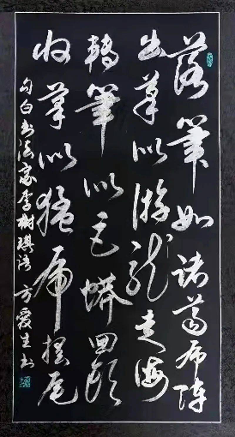 “博觀而約取,厚積而薄發。”書法之道,始於臨摹學習,成於兼容幷蓄、博採眾長之後的脱胎換骨、涅槃重生。縱觀方愛生的書法作品,既有楷書的嚴正、草書的暢快,又有隸書的柔美和篆書的古樸,基礎紮實,底氣十足,駕輕就熟,老練奔放,氣象萬千,渾然天成,盡顯大師風範無遺,無不體現出這種特質。之所以能達到此種境界,其中凝聚了故鄉齊魯之地賦予他的豪爽氣質、軍旅生涯鑄就他的鐵血柔情、三秦大地增添他的淳樸肅穆,有賴於寧夏書法家協會主席、中國標準草書學社社長鬍公石先生、中國軍旅書法名家李鐸、三秦書法泰斗吳三大、連續獲得兩次“蘭亭獎”的書壇翹楚陳天民先生的精心指導,歸功於他從小研習王羲之、趙孟頫、鍾紹京、文徵明、米芾等古代書法大家名帖時所下的苦功夫、真功夫。正是在這些經歷、名師和毅力的加持下,讓他在一次次臨摹琢磨之後,汲取了百家之優長,再經過反反覆覆的消化理解、守正創新、突破自我,才有瞭如今的生花妙筆,揮灑出筆走龍蛇的沉穩練達和韻趣雅緻,讓人佩服不已。(文/孫曉偉)