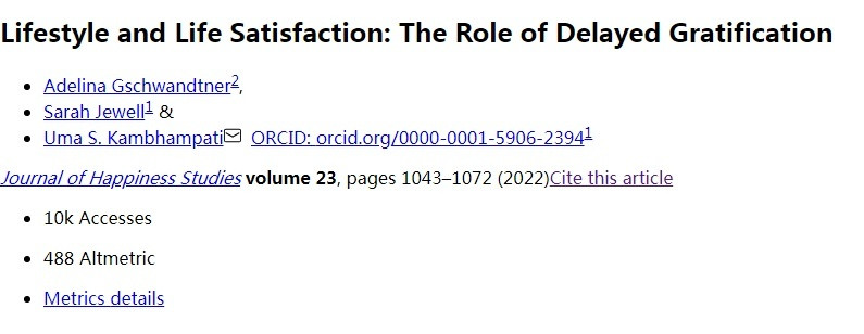 Gschwandtner, A., Jewell, S. & Kambhampati, U.S. Lifestyle and Life Satisfaction: The Role of Delayed Gratification. J Happiness Stud 23, 1043–1072 (2022). doi:10.1007/s10902-021-00440-y