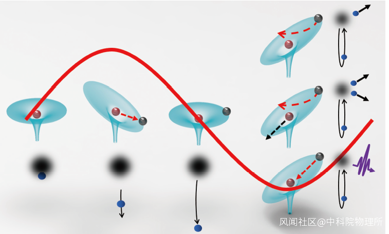 高次諧波產生的三步示意圖,其中最右邊上面兩幅圖是被加速電子額外與其他電子或原子的碰撞過程,最下面一幅圖代表被加速電子與原子複合輻射高次諧波。圖片來源:參考文獻[6].