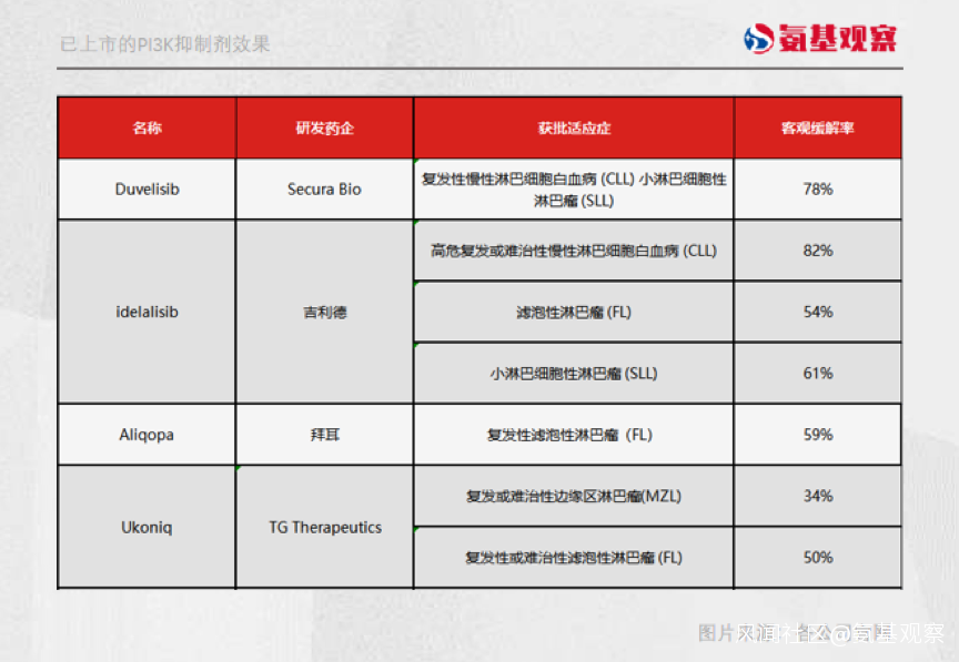 事後來看,PI3K抑制劑成藥性也被充分驗證。目前為止,全球已經有5款PI3K抑制劑獲批上市。根據這些獲批產批公佈的結果,客觀緩解率數據都驚為天人。