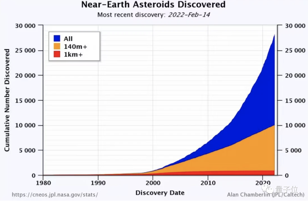 從1980年至今的統計來看,近地小行星的發現速度呈指數型增長。