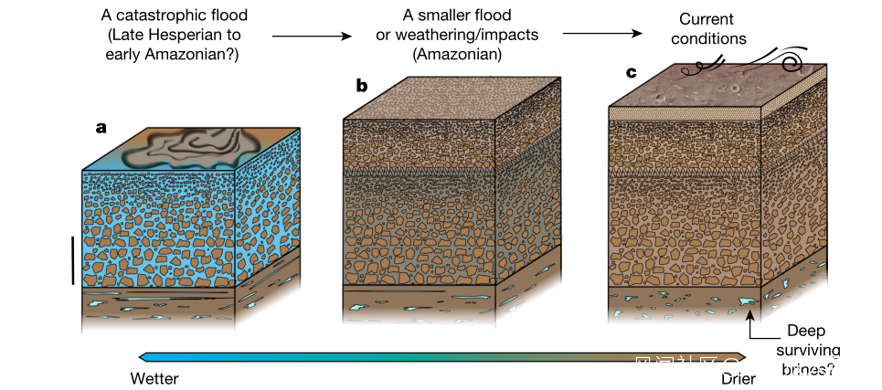 烏托邦平原南部火表改造模型圖。(a)晚西方紀至早亞馬遜紀發生了大型洪水事件,隨着洪水消退,形成了向上變細的礫岩沉積序列,比例尺為20米;(b)亞馬遜紀短時洪水、長期風化或重複撞擊作用改造了火表,形成了由小石塊堆疊構成的向上變細的沉積層序;(c)近代火星高傾角自轉導致液態水流失到高緯地區,形成現今乾燥的火壤層,火表以風成沉積和侵蝕過程為主