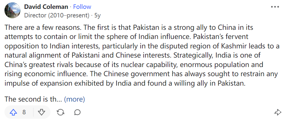 有幾個原因。第一,巴基斯坦是中國試圖限制印度勢力範圍的強大盟友。巴基斯坦熱衷於反對印度的利益,特別是在克什米爾爭議地區的利益,導致巴基斯坦和中國的利益自然而然的一致。在戰略上,印度是中國最大的競爭對手之一,因為它的核能力、龐大的人口和不斷上升的經濟影響力。中國一直試圖克制印度表現出的任何擴張衝動,並在巴基斯坦找到了一個願意合作的盟友。