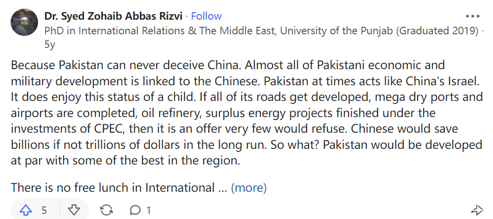 而大家都知道一個即將到來的超級大國需要什麼:盟友和朋友。當中國人對美國人説“巴基斯坦是我們的以色列”時,這意味着巴基斯坦將作為中國的前鋒,扮演一個關鍵的角色,就像以色列為美國扮演的那樣。如你所知,巴基斯坦在出生幾年後被世界拋棄了,只有中國幫助它。