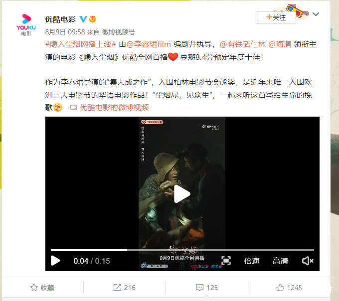 但這電影又是今年評分最高的國產電影之一,甭管這次是因為什麼原因,都是一種遺憾(也有人説是被其他視頻平台買了獨家)