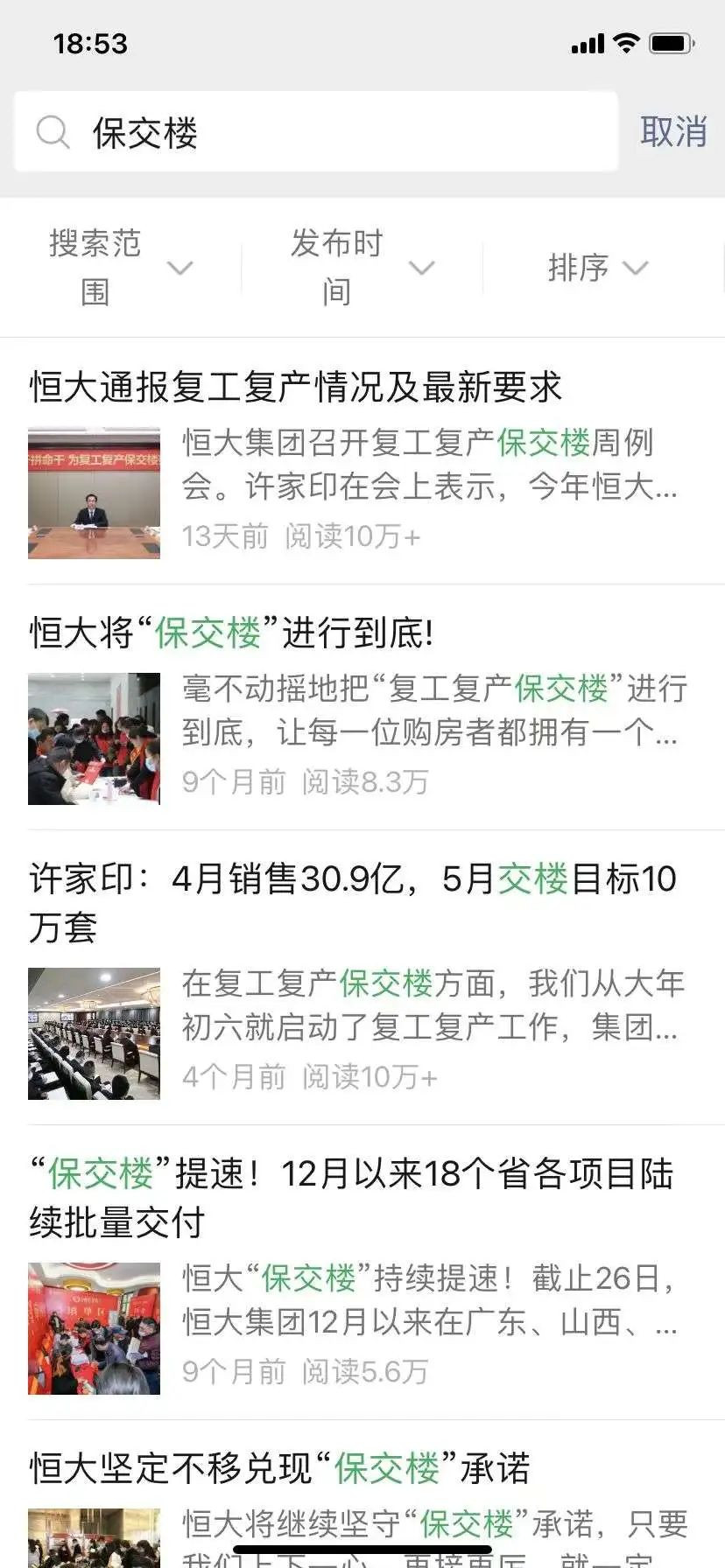 説實話,如果不是我在恒大集團公眾號搜索了一下“保交樓”三個字,差點就又被許老闆感動了。下週回國賈躍亭,明天覆工許家印,一年內喊了這麼多回,到底哪回才是真復工啊許總?