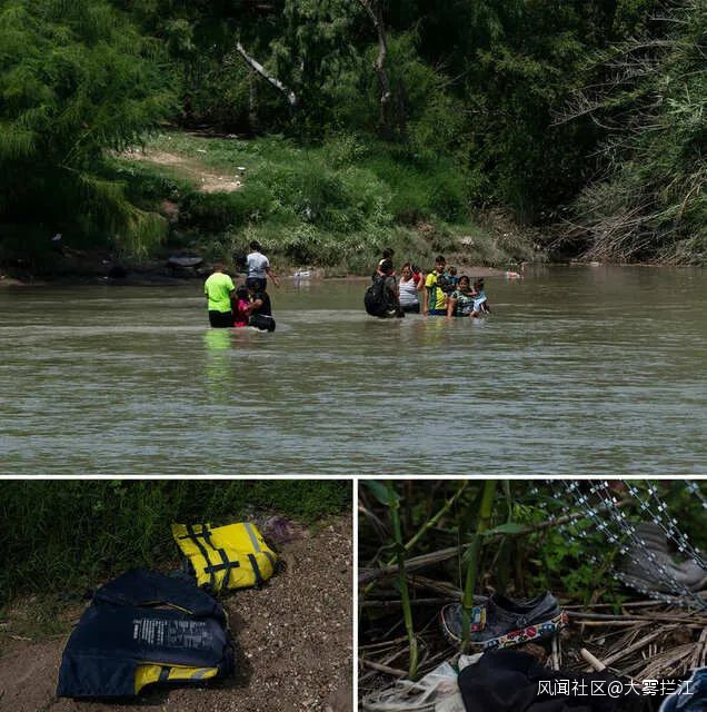 一羣人在試圖穿越德克薩斯州鷹口的格蘭德河。在河邊可以看到救生衣和其他被丟棄的物品。