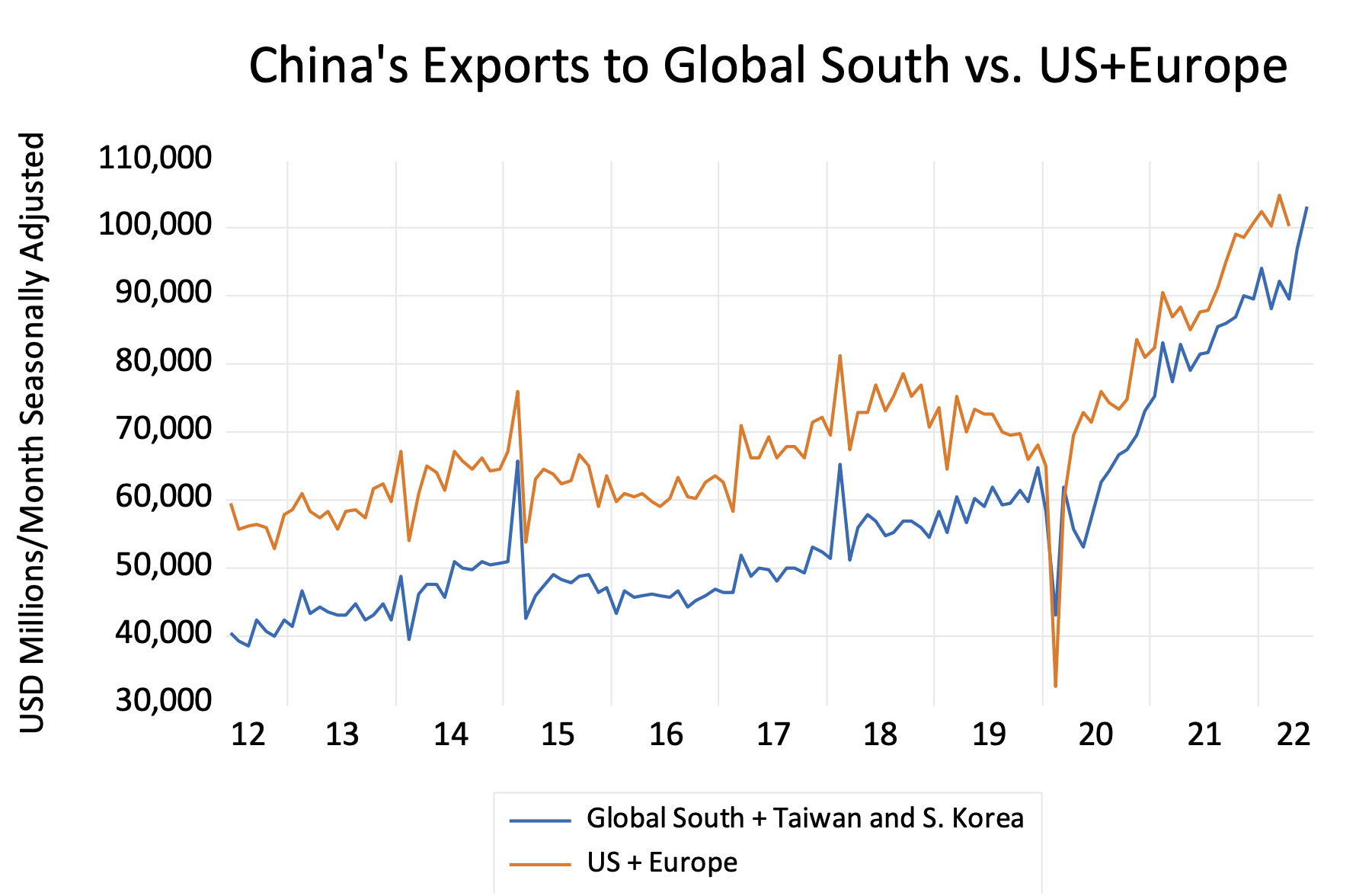 在貿易總量上,中國對美歐與中國對亞非拉加日韓已經非常接近了,後者很可能在近期超過前者,如果不是已經超過的話。後者正是中國外貿用人民幣結算的主要對象。但依然可能有很多貿易還是用美元、歐元結算的,尤其是中國從亞非拉和日韓的進口。反正中國不缺美元、日元。