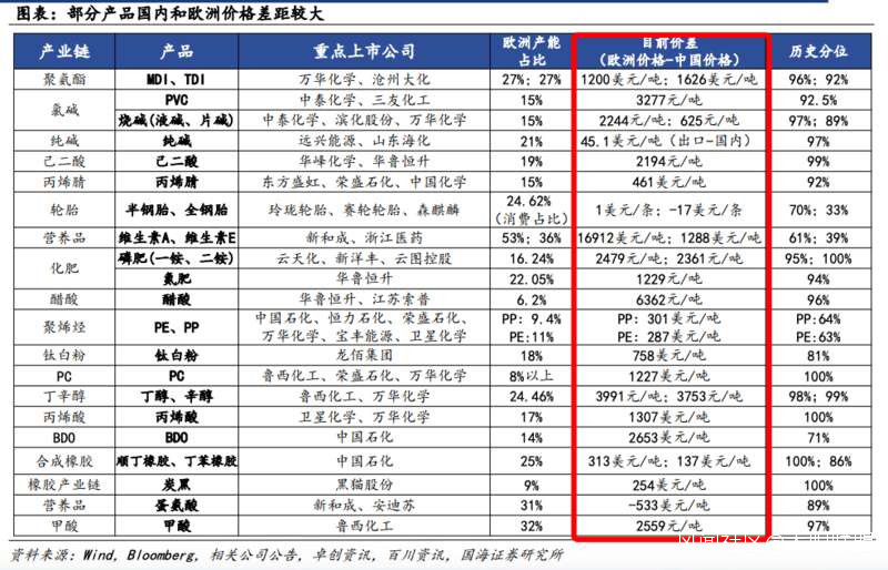 看看國海證券的這個統計圖就知道歐洲化工現在的情況有多嚴重了——紅色框框裏的是中歐兩地之間的差價,是用歐洲價格減去中國價格的結果:維生素A,歐洲比中國每噸高出16912美元。醋酸,歐洲比中國每噸高出6362元。丙烯酸,歐洲比中國每噸高出1307美元。聚氨酯,這種需求量巨大的工業必備化學品,中歐每噸價差高達1200美元。