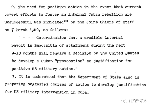 在文件的最後寫道,由於在未來9-10個月內,古巴發生內亂的幾乎不可能。美國需要製造一個“古巴的挑釁”來為美國的軍事幹預正名。