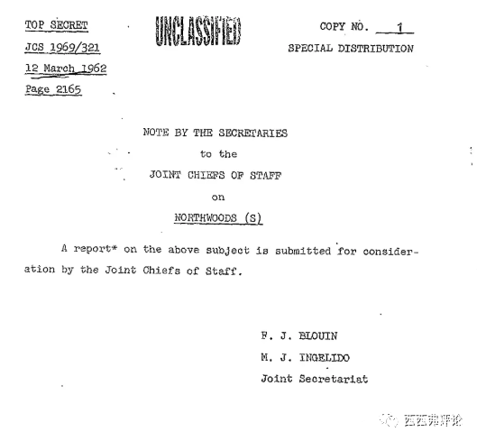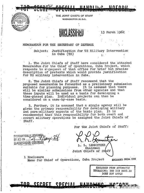 文件的題目是《正當化美國對古巴的軍事幹預》。簡單説,就是給美國入侵古巴找一個藉口。文件由美國當時的軍事最高領導人,參謀長聯席會議主席簽名。