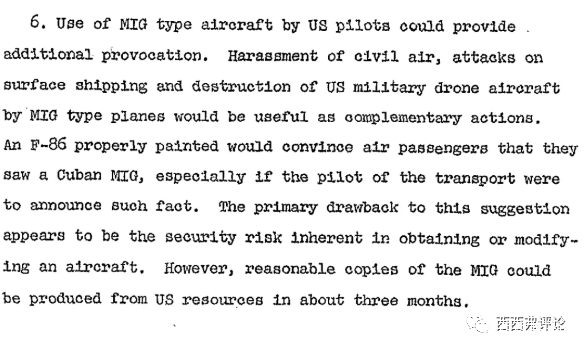 讓美國飛行員駕駛類似蘇聯的米格戰鬥機,去騷擾民航班機,攻擊船隻,摧毀美國的無人機。建議把美國的F-86重新塗裝後,偽裝了米格飛機,或者直接在美國生產幾架假米格機。