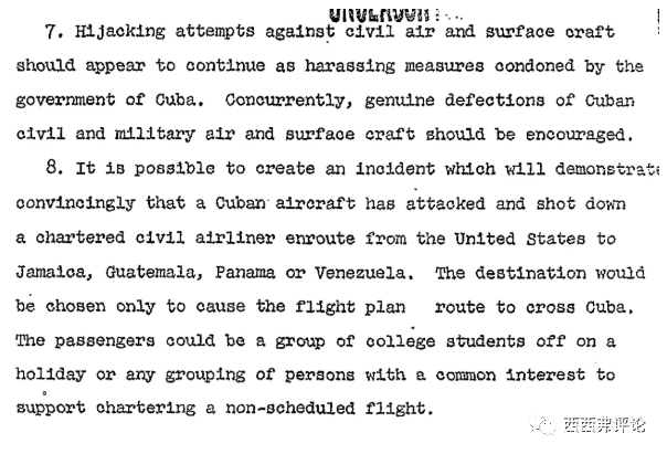 不過美國軍隊倒還沒有瘋狂到要殺掉上百個無辜的人。文件中有一個詳細的計劃,就是把搞兩架一模一樣的飛機,讓空的飛機去偽裝成載客航班去被擊落。真實載客的飛機就降落到一個美國的軍事基地,然後就可以去譴責古巴政府了。然而,這些真實的乘客後面怎麼處理,就不知道了