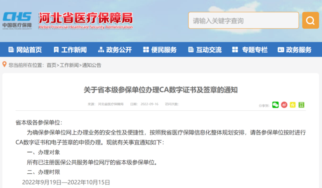 為確保參保單位網上辦理業務的安全性及便捷性,按照河北省醫療保障信息化整體規劃安排,9月15日,河北省醫保局參保登記和異地就醫中心發佈《關於省本級參保單位辦理CA數字證書及簽章的通知》(以下簡稱《通知》),所有已註冊醫保公共服務單位網廳的省本級參保單位要按時進行CA數字證書和電子簽章的申領辦理,辦理時限為2022年9月19日至2022年10月15日。