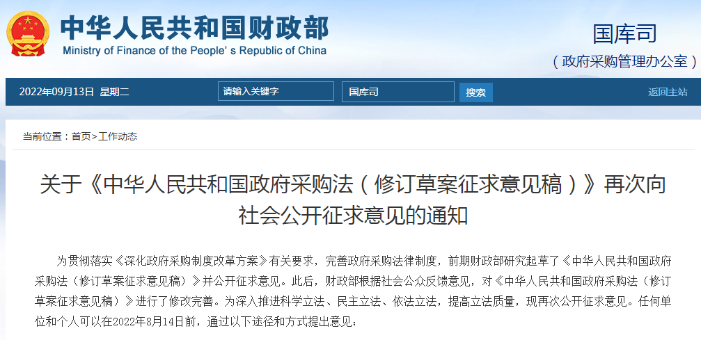 2022年7月,財政部發布《中華人民共和國政府採購法(修訂草案徵求意見稿)》再次向社會公開徵求意見的通知,提出“國家鼓勵利用數據電文形式和電子信息網絡開展政府採購活動,推動電子化政府採購。”