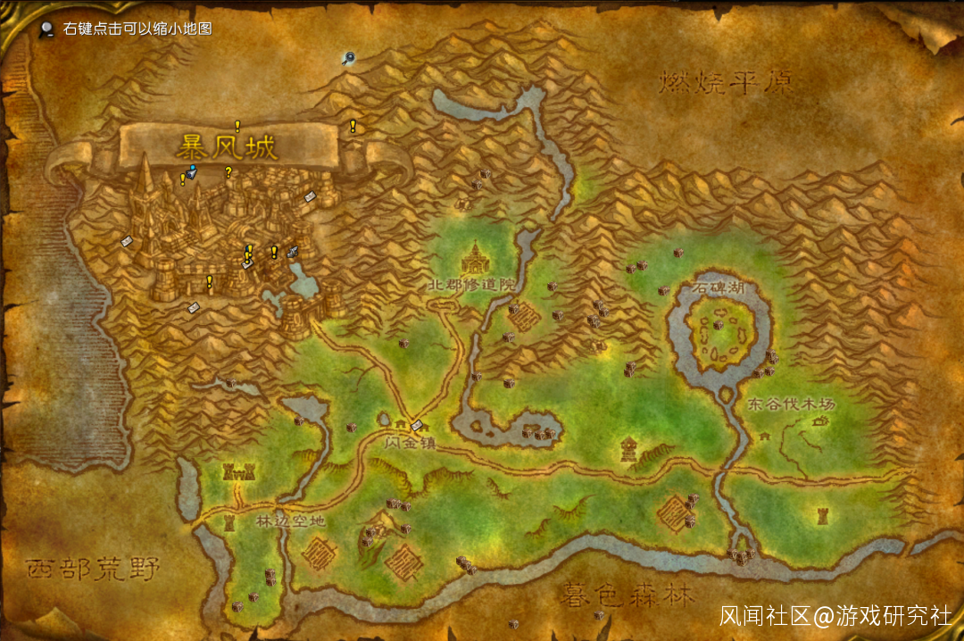 舉一個簡單的例子:所有玩家都要打無數次交道的飛行點。在60年代裏,幾乎每張地圖都只有一個飛行點,可以看下圖的艾爾文森林地圖,全圖只有暴風城一個飛行點。這實在是折磨人,因為該圖中有大量地點是玩家需要在遊戲中反覆去的:東谷伐木場是聯盟玩家學習騎術的地方,北郡修道院是人類種族的出生地,不管是拉新人入坑或者迎接朋友的小號都得來這待命,閃金鎮則是很多節日活動的必經之地,每個月的暗月馬戲團也在這。