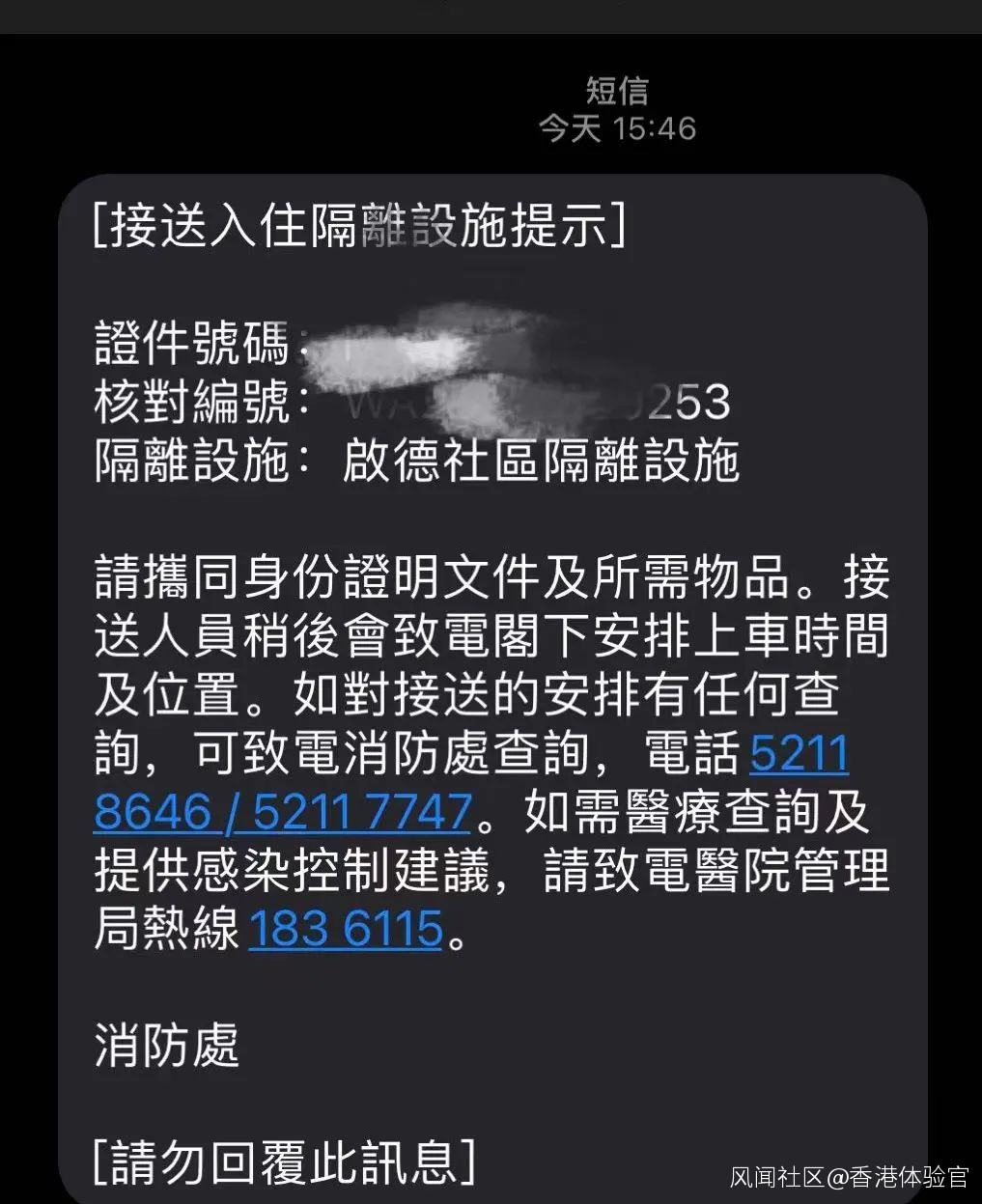 而電話後沒多久,我就收到了接送入住隔離設施的短信:通知我入住啓德隔離點。