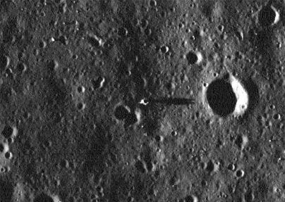 以這幀圖像為例,這與印度月船二號拍攝時間很接近,陽光處於圖像左側低點,陰影被拉得很長,此時右側的隕石坑非常明顯,陰影巨大,但的確無法分辨腳印。
