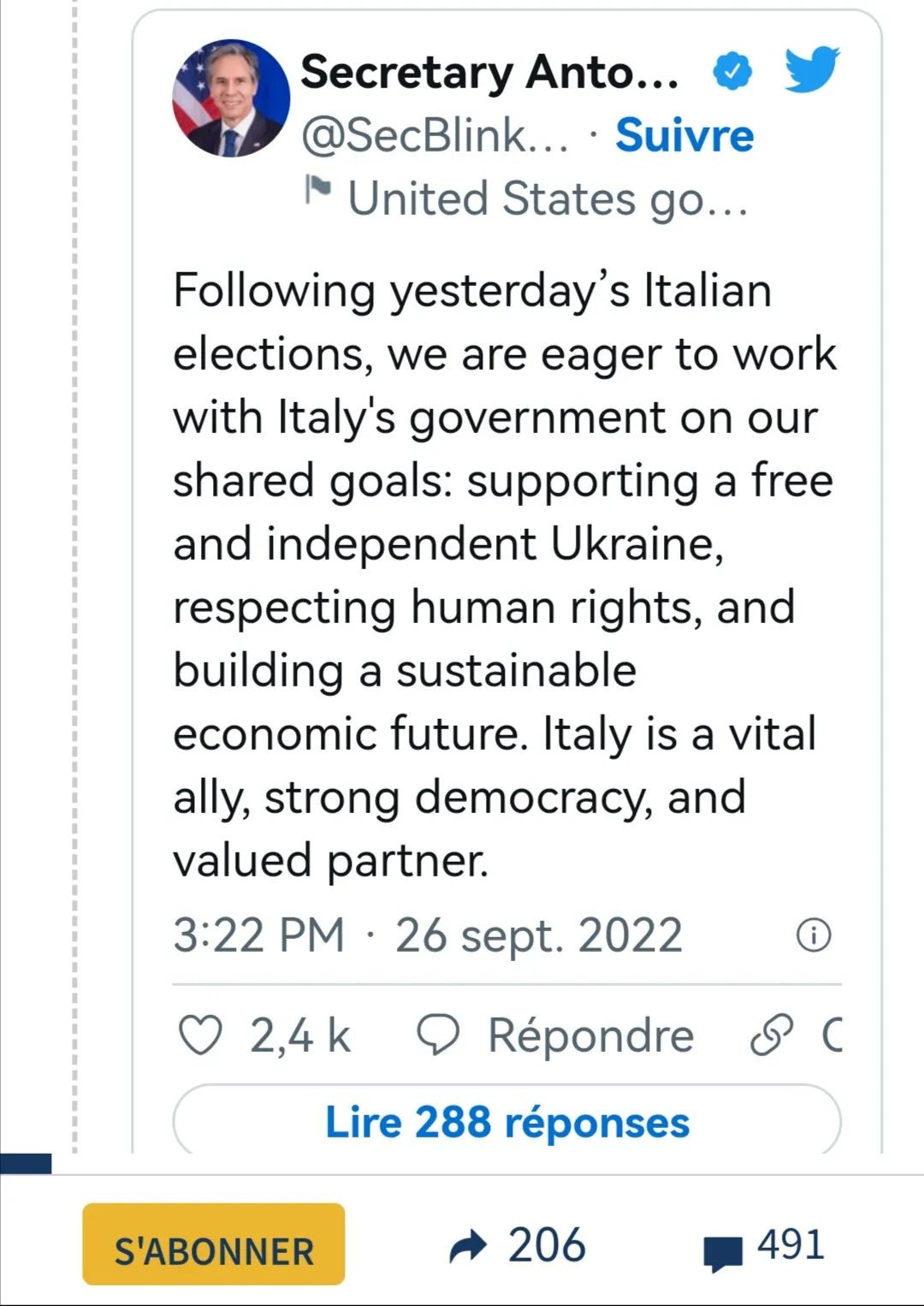 在大洋彼岸,美國國務卿布林肯讚揚意大利是“至關重要的盟友、強大的民主國家和備受歡迎的合作伙伴”。“我們非常期待與意大利新政府就共同目標展開合作:支持獨立自由的烏克蘭、遵守人權、打造可持續的經濟未來。”布林肯在推文中寫道。
