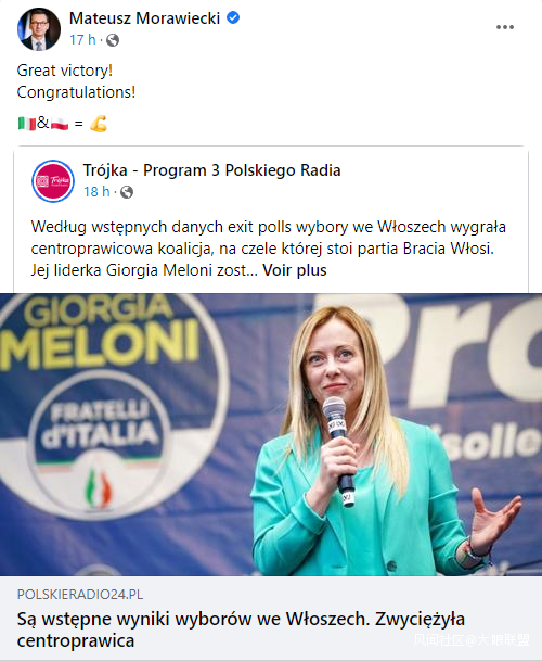 在波蘭,總理莫拉維茨基向梅洛尼表示祝賀。“偉大的勝利!祝賀!”莫拉維茨基在臉書上寫道。
