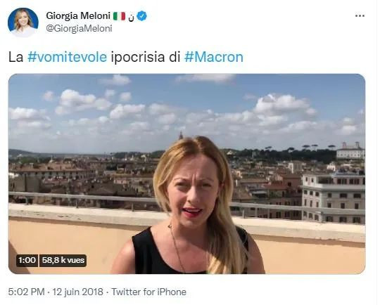 法國CNEWS電視台報道,梅洛尼對法國頗有不滿。她曾批評法國是意大利乃至歐盟移民大規模增加的“罪魁禍首”,並呼籲法國停止其在非洲的“殖民化”政策。