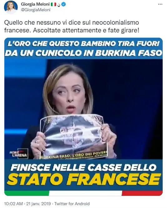 2019年,梅洛尼在意大利一個電視節目中展示了一張在礦場工作的布基納法索兒童照片。她當時聲稱,這個兒童在他的國家開採的黃金最終“進入了法國國庫”。“布基納法索的貨幣——非洲法郎是在法國央行印刷的。作為交換,法國拿走了該國50%的收入,包括這個孩子在這個洞裏收集的黃金……”
