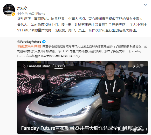 9月27日,意氣風發的賈躍亭還發文説,這是FF“撥亂反正、重回正軌”的標誌。