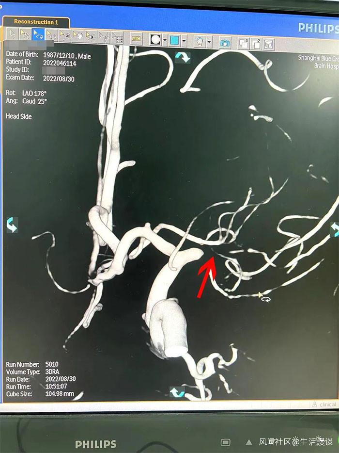 在檢查中發現,周先生右側大腦中動脈M1段閉塞,可見煙霧狀異常血管網生成;左側大腦中動脈M1段重度狹窄(約70%)。符合煙霧病的典型影像學特徵。