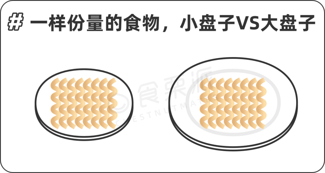 大腦很容易被視覺效應所欺騙,大盤子會顯得食物更少,所以我們會下意識地裝更多。所以如果你不想吃太多,可以用小盤子換掉大盤子,這樣不僅能夠顯得食物量很多,多次站起來去取餐還能增加一些運動消耗機會。