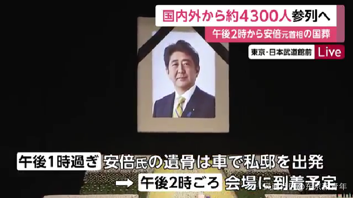 下午13點多,裝有安倍骨灰遺體的車輛將從他東京的私人住宅出發,於下午14點左右到達會場。