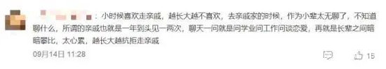 在傳統家庭結構中,維護血緣聯繫,對於整個家族、對於家族中每個人的生存和發展都至關重要,而隨着大家族結構的瓦解,居住分散,親緣關係變得淡漠;社會保障等的完善,使抵抗風險的渠道變多,親戚不再是獲得幫助的唯一途徑;城鎮化帶來了人口的遷移流動,親戚之間聚少離多;兄弟姐妹變少,親戚的數量縮減;網絡改變社交方式,線上“社牛”、線下“社恐”的新生代,懶於跟親戚互動交流。