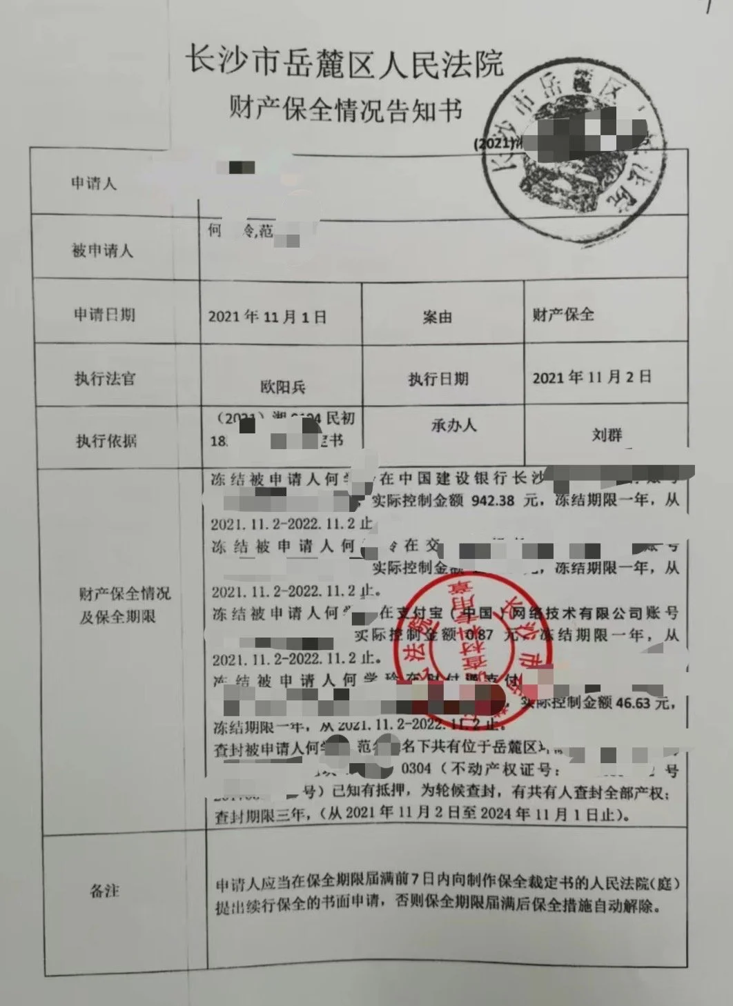 在一審開始前,唐女士向法院申請了財產保全,據嶽麓區人民法院出具的情況告知書,作為被申請人的房東和其妻子名下只有現金一千多元及這套房產。而這套房產“已知有抵押,為輪候查封”。