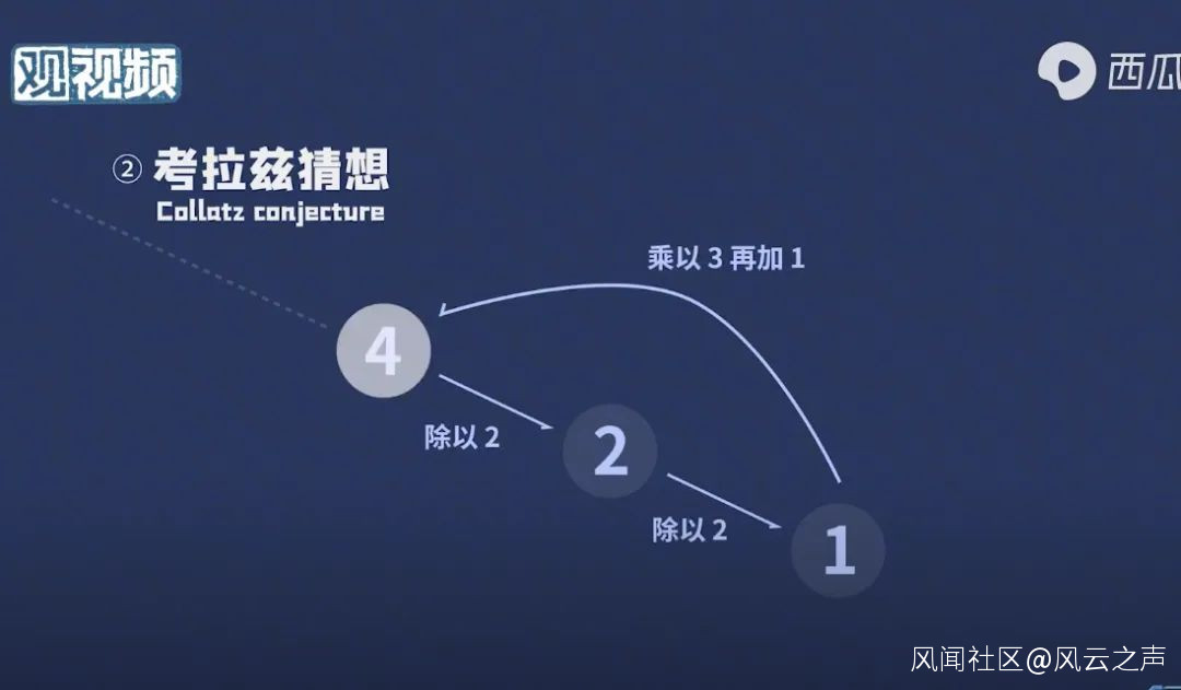第二個問題是考拉茲猜想(Collatz conjecture),或者稱為角谷猜想、冰雹猜想、421猜想、3x + 1猜想等等。最後這個名字,3x + 1猜想,會讓人很快明白它説的是什麼。取一個正整數x,如果它是偶數,就把它除以2,如果它是奇數,就把它乘以3再加上1,即變成3x + 1。然後按照同樣的規則,把這個操作無限進行下去。這個猜想説的是:無論你最初取的x等於多少,最終都會進入4-2-1-4-2-1的循環。稍微想一下就會明白,進入這個循環就出不來了,因為4的下一步是2,2的下一步是1,1的下一步又回到了4。但問題在於,是否一定會進入這個循環呢?
