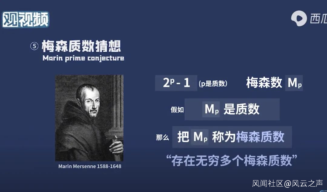 第五個問題是梅森質數猜想。梅森(Marin Mersenne, 1588-1648)是十七世紀的法國數學家,他研究了2^p - 1類型的數,其中p是一個質數。現在我們把這樣的數叫做梅森數,記為Mp。假如對於某個p,Mp是個質數,就把它稱為梅森質數。梅森質數猜想説的就是:存在無窮多個梅森質數。
