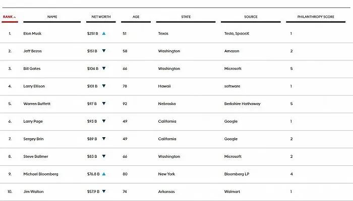 **福布斯9月27日發佈美國2022年度福布斯400強榜單,馬斯克以2510億美元的財富取代連續四年“霸榜”的貝索斯,首次位列榜首。**比爾·蓋茨、拉里·埃裏森、沃倫·巴菲、拉里·佩奇、謝爾蓋·布林、史蒂夫·鮑爾默、邁克爾·布隆伯格、吉姆·沃爾頓分列3至10位。