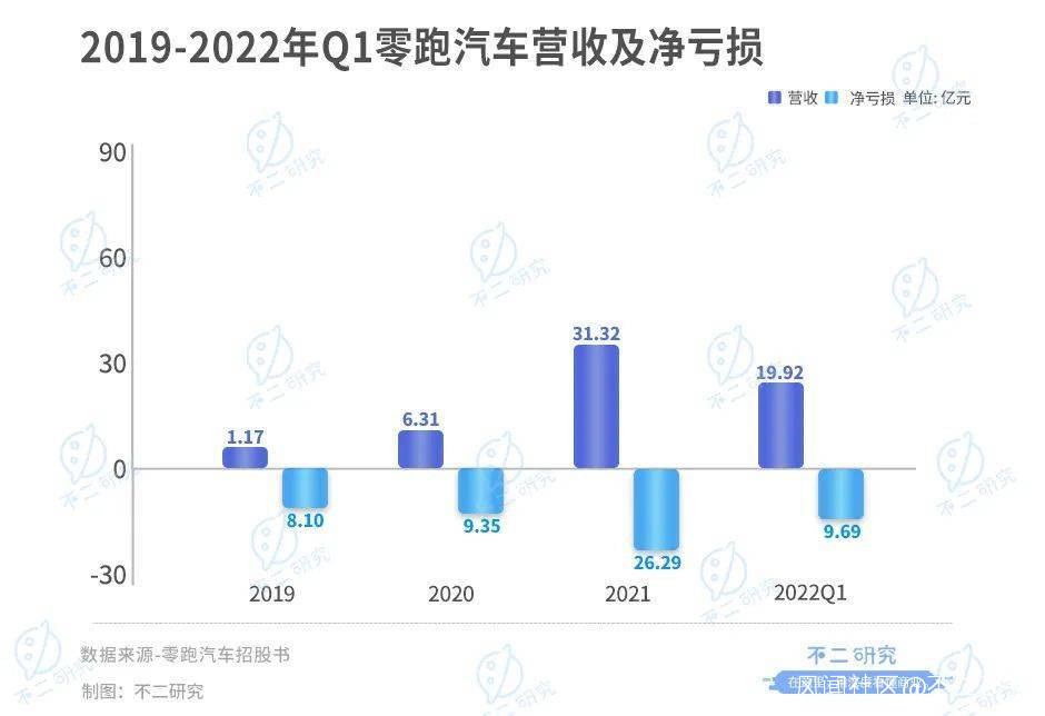 「不二研究」據零跑汽車招股書發現:今年一季度,零跑汽車營收19.92億元,同比增加616.37%;同期,其經調整後的淨虧損為9.69億元,同比增加161.04%。