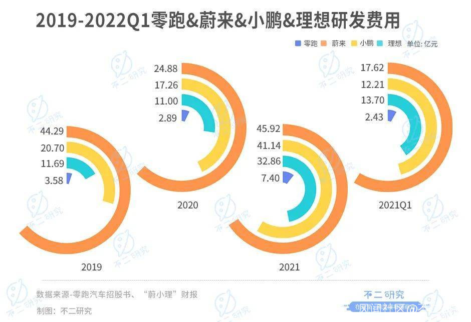 而據“蔚小理”財報顯示,2019-2021年及2022年一季度,蔚來汽車為44.29億、24.88億、45.92億和17.62億;小鵬汽車為20.70億、17.26億、41.14億和12.21億;理想汽車研發費用分別是11.69億、11.00億、32.86億和13.70億。