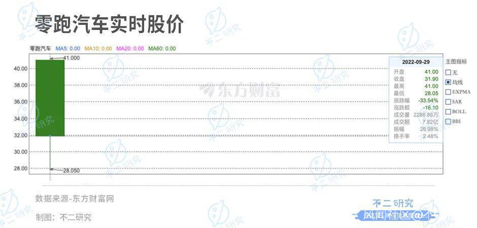 截至9月29日港股收盤,零跑汽車報收31.90港元/股,跌幅達33.54%,對應市值364.5億港元(市值摺合人民幣約為334.2億元)。