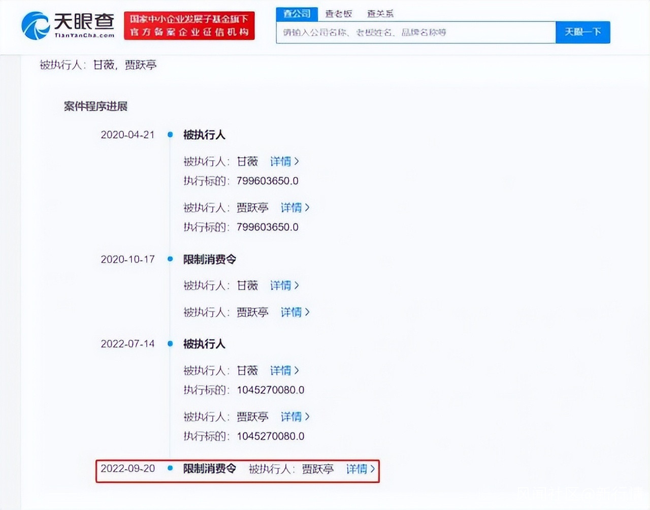 涉及案件為賈躍亭與西部證券股份有限公司相關合同糾紛,該案於2019年首次執行,被執行人為賈躍亭、甘薇,此後兩次被恢復執行,最新一次為今年7月被恢復執行10.45億元,賈躍亭、甘薇也曾於2020年10月因該案被限制消費。目前,賈躍亭累計被執行金額超68億元。