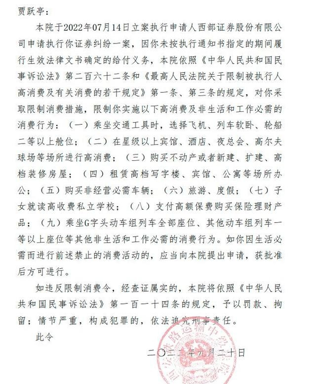 近日,賈躍亭新增一則限制消費令信息,因賈躍亭未按執行通知書指定的期間履行生效法律文書確定的給付義務,被採取限制消費措施。